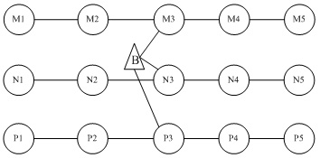 2)可以和移动节点直接通信的节点:接收到RREQ后,首先更新邻居链表,然后将本地路由表里的下一跳写下B,更新路由表。如图1中,M3、N3、P3此时和B直接相连,分别是三个簇内其它节点接入上层节点的出口。
