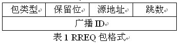 其中,包类型:用于标明该数据包是RREQ包,广播包;源地址:发起RREQ的节点地址,应为上层网络节点的地址;跳数:源节点到接收到RREQ包的节点经过的跳段数;广播ID:由源节点维护的序列号,用于唯一标识RREQ包。