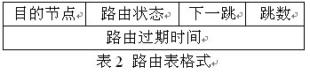 其中,目的节点:记录目的节点地址,应为上层网络节点的地址;路由状态:路由是否有效标志;下一跳:本地节点到目的节点的下一跳节点地址;路由过期时间:路由不再有效的时间点。