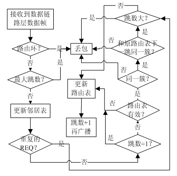路由建立过程的思想是,由上层节点在全网范围内广播路由请求数据包RREQ,底层节点收到RREQ后即更新邻居链表,同时更新路由表,然后同样以广播的方式转发RREQ,但只转发同一簇内的RREQ;本地节点在同一簇内建立路由,但维护的邻居链表包括整个网络的邻居信息,以记录网络的连通性。