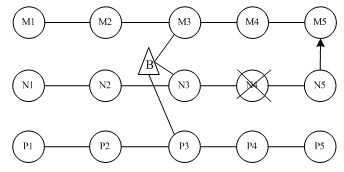 在带状的拓扑结构里,同一簇内邻居节点有限,多数情况下只有左右两个节点是其邻居节点,如果某一节点由于能量耗尽,簇内节点可能会断开,将影响网络的健壮性和可扩展性,如图3,节点N4由于某种原因不再具有传感器节点的功能,N4以右的节点按先前发现的路由无法将数据传送至目的节点B,因此必须采取某种措施以维护网络的连通性。节点同时拥有其它簇内的邻居节点,可以借助其它簇内的节点续传数据包。