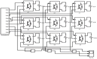 在Matlab/Simulink中建立了整个系统的仿真模型。其中,电机模型采用软件自带的两级三相异步感应电机模型,参数为:额定功率PN =3730W,额定线电压UN =380V,额定频率fN =50Hz,转子电阻Rr=1.083Ω,定子电阻Rs=1.115Ω,定子、转子电感Ls= Lr=0.2097H,定转子互感Lm=0.2037H,转动惯量J=0.02kgg㎡。逆变器每级直流电源电压为104V,采样周期Ts=952μs。