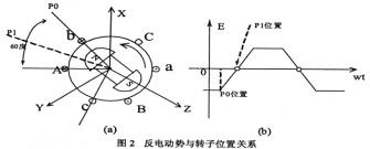 研究对象永磁直流无刷稀土电机将磁体粘贴到转子铁心表面,组成所谓的隐极式转子结构。其定子三相对称绕组采用整距、集中绕组,无中线引出线,由电机学原理可知反电动势的波形为一梯形波,而且电机中A、B、C三相是对称的,它们的反电动势只在相位上依次落后120度。再考虑到定子每相绕组的反电动势正比于转子角速度,有图2所示关系。