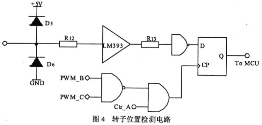转子位置检测电路用于测取电机反电动势过零点信息,从而获得转子位置,而且是通过检测电机的端电压来实现的。电路设计如图4所示。