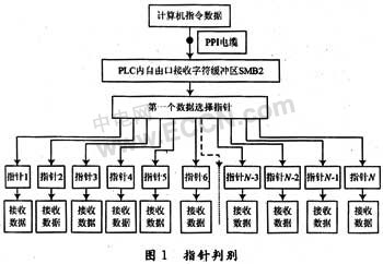 在PLC与计算机的自由口通讯中,为消除“RCV”或单指针接收计算机数据带来的大数据流,本文在计算机每次向PLC发送指令时,第一个字节总是模式的代号,从第二个字节开始才是指令数据的内容。在PLC接收数据时,第一个数据进入“自由口接收字符缓冲区”SMB2时,PLC通过“选择指针”最先接收的是指针判别的代号,通过接收代号的数值比较来判断该指令数据对应的是哪种数据,判断完成后定义一个地址指针接收并存储这种数据的内容。不同的指针判别代号对应不同的地址指针,因此计算机每次写入PLC指令时发送的指令数据都是由两部分构成:第一部分为指针判别代号,第二部分为指令数据的内容。指针判别过程是PLC内接收到判别代号后进行数值比较。指针判别的意义就是通过一个总指针接收模式代号,用不同模式代号再定义多个指针完成不同种类的指令数据的接收与存储。