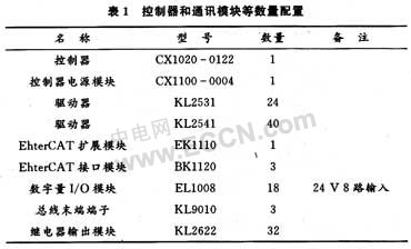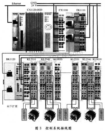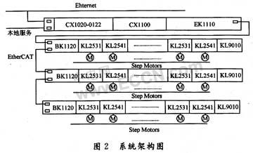 采用基于嵌入式PC的模块化运动控制器,型号为CX1020,运动控制器本身集成双Ethernet接口,其中一个向上连接到现场工业以太网,接受运动控制的调用指令,另一个可以作为本地调试的网络接口。运动控制器、运动控制网络接口部件、步进电机驱动器通过硬实时的超高速以太网EtherCAT(Ethernet for Controland Automation Technology)构成运动控制网络系统,采用EtherCAT取代以往的现场总线传输技术,可以显著减少控制系统CPU的负荷,而且无需任何智能主站卡,适合集中式与分布式控制体系。