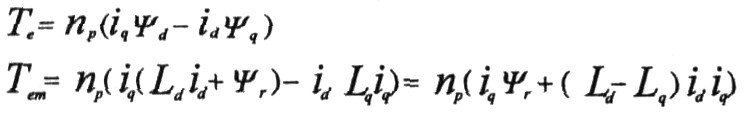 永磁同步电动机是交流同步调速系统的主要环节,分析其数学模型对把握其调速特性尤为重要。取转子永磁体基波励磁磁场轴线为d轴,q轴顺着旋转方向超前d轴90度电角度,dq轴系随同转子以角速度ωr一道旋转,它的空间坐标以d轴与参考轴α间的电角度θr来表示,则理想永磁同步电机在dq旋转坐标系中的数学模型可以写成如下形式:
