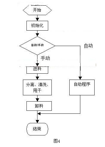 编程采用编程软件MELSECMEDOC专业软件包,它基于个人计算机,适用于三菱公司PLC用户程序编制和监控,SC-09RS232/RS422接口与PLC编程口相连,可用梯形图或指令编程。本系统PLC梯形图程序控制要求采用STL和SET步进指令编制。主要有初始化设定,进料、分离、清洗、甩干控制程序、自动控制程序等。程序设计中采取安全保护有:转速检测,过振动保护,开盖保护,电机过载过热保护,刮刀旋转,升降机械电气双重控制,刮刀与转鼓联动锁定。程序流程图4所示。