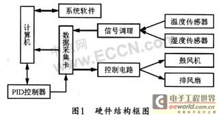 该系统的硬件部分先将温湿度信号转换成电信号,并将调理后的数据传人计算机,之后由采集卡输出控制信号来对温湿度控制器件进行控制。系统的硬件由温湿度传感器,DAO卡(数据采集卡)、控制电路、鼓风机及排风扇组成。图1所示为硬件结构框图。