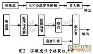 系统采用硅单晶温度传感器和相应的电路来捕获温度信号,并将温度信号转换成电压信号。同时采用UD-08湿度传感器和相应的电路来捕获温度信号,并将其湿度转换成电压信号。其组成框图如图2所示。