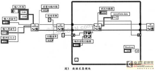 图3是使用中级模入设计的数据采集程序框图。该程序先用Device Open.vi模块打开数据采集设备;然后用AI Config.vi模块来配置数据采集卡.选择模拟量输入通道,指定输入信号的范围(调节硬件增益),设置采集数据所占用计算机缓冲区的大小及设置扫描间隔:再通过AI Start.vi启动模入操作,其作用主要是控制数据采集速率和要获得的扫描数,这里将Number of scans to acquire(获得的扫描数)输入端口值设置为“0”即可选择连续采集模式,直到清除模入操作为止(如果设置为“-1”则只要缓冲区满就停止扫描);AI Read.vi的作用是从AI Config分配的缓冲中读取数据,它能控制每次读取的点数、读取数据在缓冲中的位置等,它的输出是一个二维数组,其中每一列数据对应于通道列表中的一个通道;最后,通过AI Clear.vi模块来清除模入操作和计算机中分配的缓冲,并释放所有数据采集的资源。