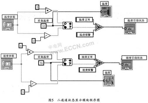 温湿度报警模块完成的主要工作是规定所采集的温湿度信号的范围及相对应的状态,以较为直观的方式从视觉或听觉上提示用户。系统二通道数据状态分析模块程序如图5所示。系统用InRange and Coerce.vi来判定所采集数据的范围,使用Select.vi对判定结果作出选择,如果采集数据在规定范围内则显示“正常”,否则为“报警”状态,采集数据与状态可同时显示到前面板上。首先烟农在烤烟的三个阶段的开始时预先设定温湿度参量,然后由程序自动运用加减图形代码的运算得到温湿度上下限,来随时查看最后通过前面板的显示数据和状况。