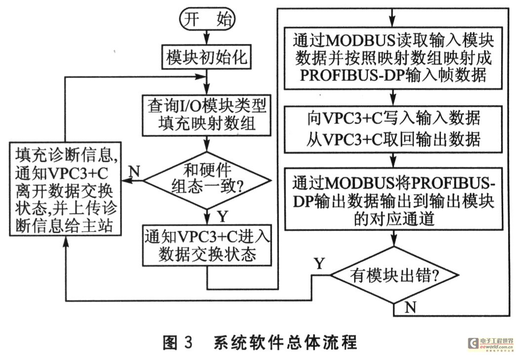 CPU通过驱动VPC3+C来实现对PROFIBUS熔一DP通信过程的控制,包括通信接口检查、正常和发生故障情况下诊断数据的发送及数据交换等过程;通过MODBUS协议实现对下挂的输入/输出从站模块的查询操作;通过对输入/输出模块的应答帧(或通信超时)进行分析来判断模块的状态以及模块的通道状态;根据模块状态信息填充PROFIBUS-DP的诊断域的数据,并以此为依据来对网关状态(正常通信、报告错误或警告信息)进行控制。