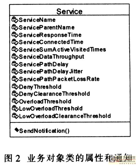 在面向业务的网络管理系统,把可以存储、管理和操作的所有业务用一个统一的抽象名字“业务对象”标记。实际上,业务对象就是对被管对象和相关支撑资源的抽象。按照面向对象技术的思想,将具有相同管理操作、属性、特性组、通知和行为特性的业务对象组合成一个“业务对象类”。“业务对象类”只是一个虚的概念类,它仅描述类的类别。业务对象类可以派生子类,子类可继承父类的各种特征量,如图2所示。当一个具体的业务实体作为某类业务对象存在(创建)时,该实体就被称为业务对象实例。对于接口的实现,在网络层和业务层进行交互时,更多需考虑对象实例的属性,因此首先需描述对象实例的属性。对象实例的属性主要包含属性名字、属性值、对属性的操作特性等。同一个类中的属性名应具有唯一标识性。属性值可通过内在的系统手段、网络活动或管理活动读取和修改,但修改活动受属性操作特性的限制。在定义业务对象时可以规定某些属性对外部系统是只读的,也可规定属性值改变的条件等。一般每个业务对象拥有多个属性。为方便网络业务的管理。为业务对象定义许多可见属性,如业务名称、业务类型、业务响应时间、业务接入时间、业务活动访问计数、业务数据吞吐量、业务通路延迟、业务通路延迟抖动、业务通路丢包率等。如图2所示。