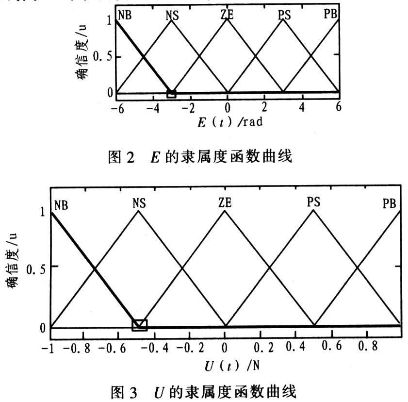 输入变量E、EC,输出变量u;E、EC论域设定:E=[-6,6],EC=[-6,6],输出论域U=[-1,1]均采用三角型、全交迭、均匀分布隶属度函数。每个变量用5个模糊子集{NB NS ZE PS PB}来描述,隶属度函数曲线图如图2、图3所示。EC的隶属度函数曲线同E的隶属度函数曲线。