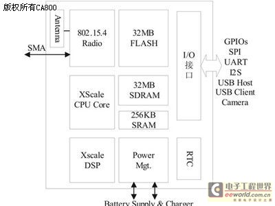 在设计无线传感器网络网关时,需要较强的数据处理能力,用以实现复杂路由协议以及信息处理等。如图5所示Crossbow的imote2节点采用了MarvellPXA271高性能、低功耗处理器。该处理器使用动态电压调节技术,频率范围13MHz"416MHz,可工作于低电压(0.85V)低频率(13MHz)模式,具备了优良的动态电源管理技术。此外,该处理器封装内集成三个芯片256KBSRAM,32MBFLASH以及32MBSDRAM,减小了体积。通过提供多种I/O,能够灵活的支持不同种类的传感器。该处理器还支持一个MMX协处理器,提高多媒体处理能力,可以用于无线多媒体传感器网络中的语音和图像处理。Imote2使用TI的CC2420ZigBee射频芯片,支持2.4GHz、16通道250kb/s数据传输,发送功率-24~0dBm。有效通讯距离是30米,可以通过SMA接口外接天线来增加传输距离。