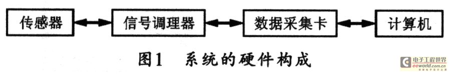 本系统的硬件由传感器、信号调理模块、数据采集卡和计算机组成,其硬件结构如图1所示。
