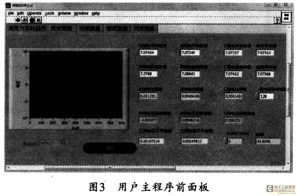 电能质量监测的整个系统可分成采集与实时显示、伏安测量、功率测量、闪变测量及谐波测量等五个大的模块,可在主程序界面的前面板中以五页显示,同时也可以通过调用不同的小功能模块来构成。