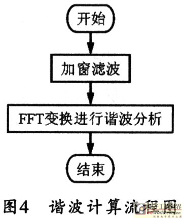 由于谱泄漏的原因,为了减少泄漏误差,避免信号在做谐波分析时发生混叠,首先要对信号进行加窗处理,再通过FFT变换完成谐波分析。这里以A相电压的谐波测量为例,给出了如图4所示的基于LabVIEW的谐波计算流程图。