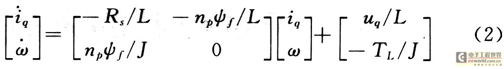 若电机为隐极电机,即Ld=Lq,选取定子电流id,iq及电机机械角速度ω为状态变量,可以得到永磁同步电机的状态方程如下式所示: