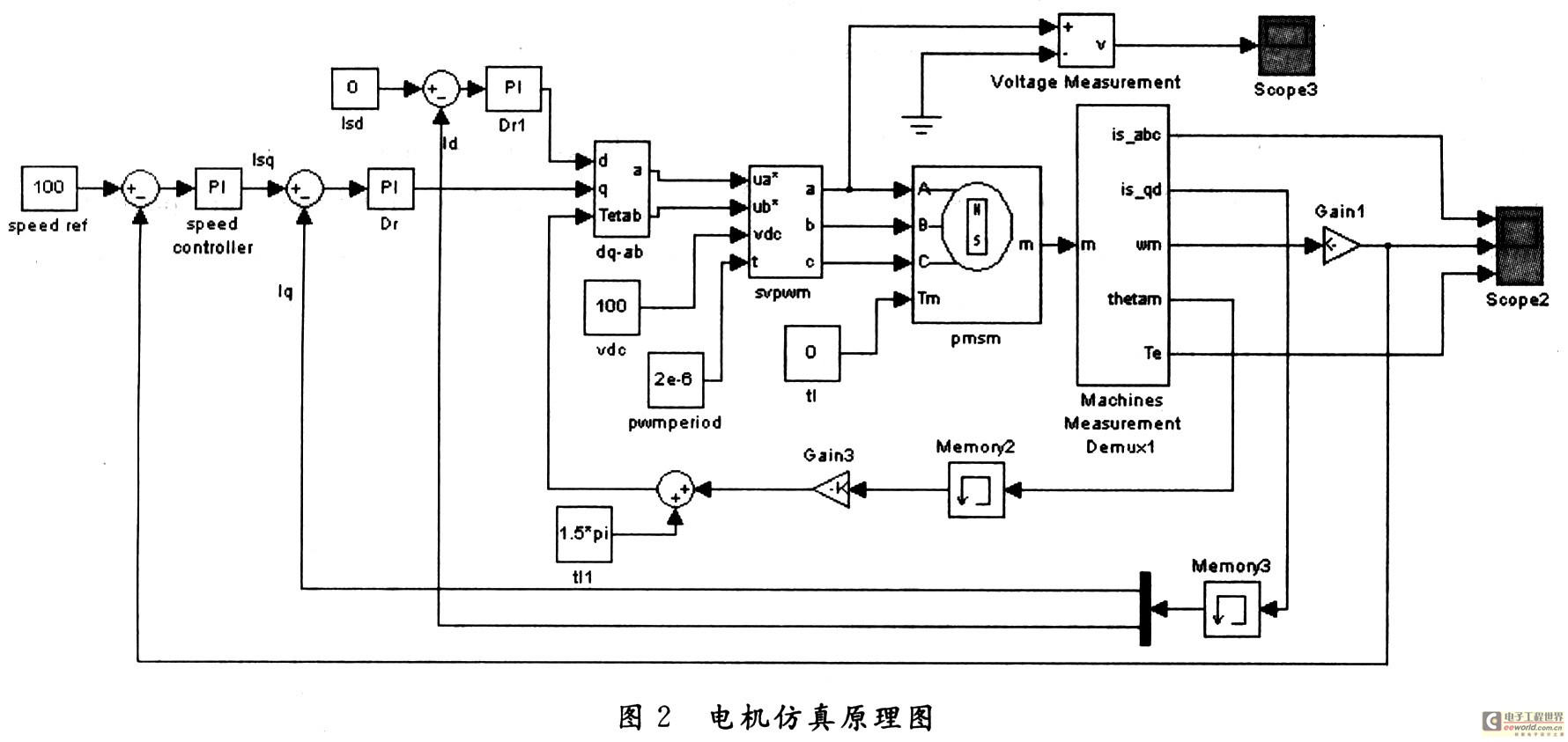 在Matlab/Simulink中搭建了采用PI控制的永磁同步电机交流调速系统的仿真模型,进行仿真研究,电流环、速度环均采用工程领域广泛使用的PI控制,来验证系统采用PI控制的效果,仿真原理图如图2所示。