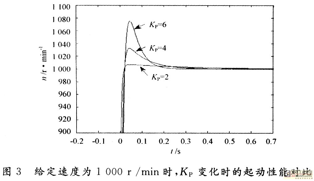 首先,考查PI控制器中增益P对系统性能的影响。在PI控制器中,我们固定积分增益K1=10,比例增益Kp=2,4,6变化时,分别测试电机在给定速度为1 000 r/min下的动态曲线,得出对比效果见图3,图4。