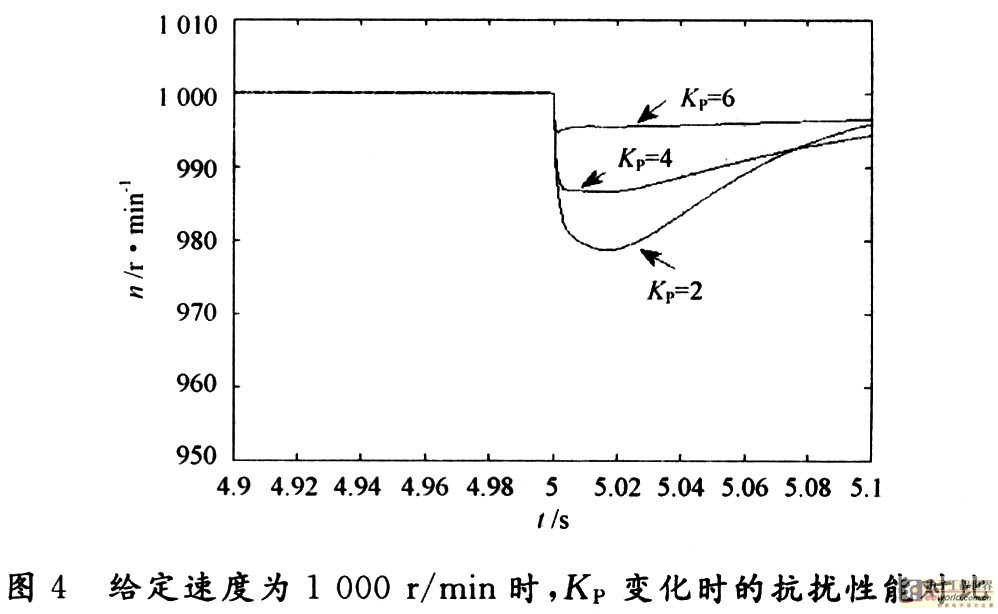 从图3,4中可见,随着比例增益KP的增加,系统的超调加大,出现了静差,但是系统的抗扰动能力得到了增强。