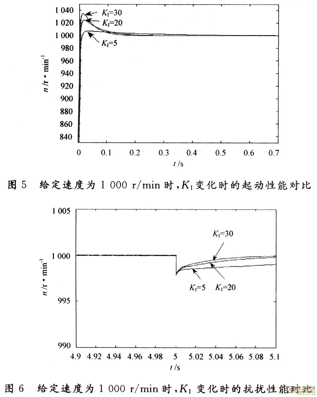 接着,我们考查积分变化对于系统性能的影响。PI控制器中,我们固定比例增益KP=5,积分增益K1=5,20,30变化时,分别测试电机在给定速度为1 000 r/min下的动态曲线,得出对比效果如图5,图6所示。