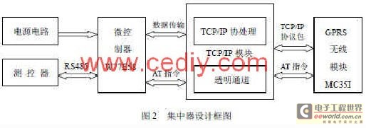 微控制器通过 AT指令初始化 GPRS无线模块,使之附着在 GPRS网上,获得网络运营商动态分配给 GPRS集中器的 IP地址并与抄表终端建立连接,通过 RS232串口向客户系统收发数据或指令,向 TCP/IP模块收发数据等。