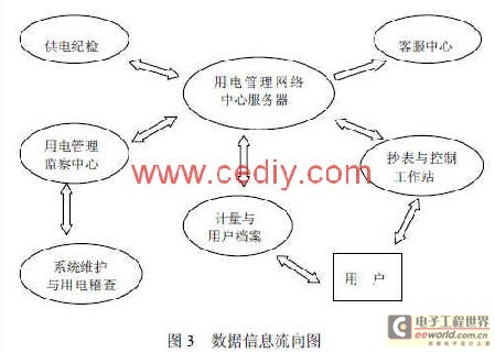 用电管理主要包括业扩报装、计量管理、电费管理和用电监察等几个方面。用电管理除有较明显的各内部业务功能外,还具有较强的业务流程性。数据信息流向如 3所示。
