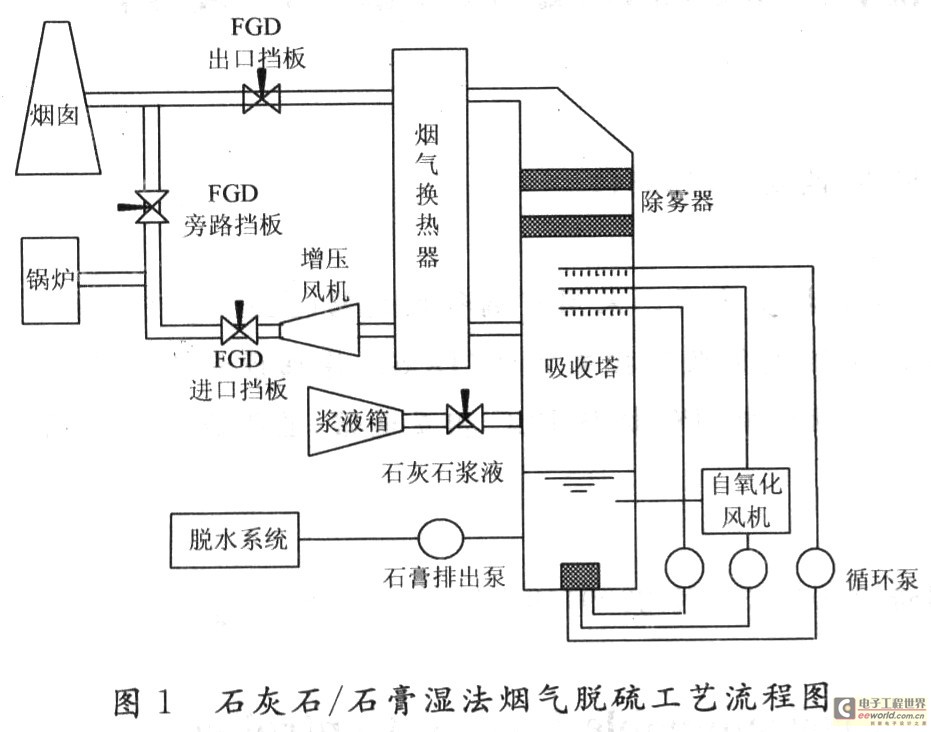 我国是燃煤大国,煤炭占一次能源消费总量的75%。随着煤炭消费的不断增长,燃煤排放的二氧化硫也不断增加,致使我国酸雨和二氧化硫污染日趋严重。为了实现SO2的减排目标,国家制定了一系列的环保措施。目前国内烟气脱硫工艺设备的设计、制造、安装和调试水平已有了大幅度的提高,已建成、投运了一大批大型机组火电机组烟气脱硫系统。但据了解,目前投运的火力发电厂都还存在着不少这样或那样的技术问题,其中热工自动化投入水平不高是其中的一个重要技术问题,如测量不准,系统自动投不上,系统调节品质差等,致使一些电厂的脱硫系统出现运行故障多、不能与发电机组完全同步运行或运行中脱硫效率达不到设计值或系统运行成本高等问题。对于整个烟气脱硫系统,作为监视、控制脱硫系统运行的控制系统是重要的组成部分,它既要保证脱硫系统的正常工作和异常工况的系统安全,又要与单元机组控制系统相协调,保证锅炉的安全运行。