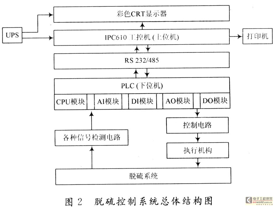 在分析、比较上述三种脱硫控制系统设计方案的基础上,构建了由工控机和PLC组成的上下位机脱硫控制系统,其结构框图如图2所示。系统以“研华”IPC-6102工业控制计算机(PC)作为系统上位机,配以PHILIPS 21寸彩色显示器,激光打印机和键盘等;西门子(SIEMENs)SEMATIC S7-300可编程控制器作为系统下位机。PC通过适配器MPI卡(多点接口卡)与PLC互相通讯、互相联系。为确保突然停电时不影响上位机监控系统的运行,系统配置有UPS(Uninter-ruptible Power Supply,不间断电源)。PLC用于现场设备参数和信号的采集、运算、调节输出、控制各设备运行;上位机主要用于工艺运行参数设定、系统调节参数设定、实时运行曲线检测和设备故障报警等,实现脱硫控制过程的自动化管理与控制。