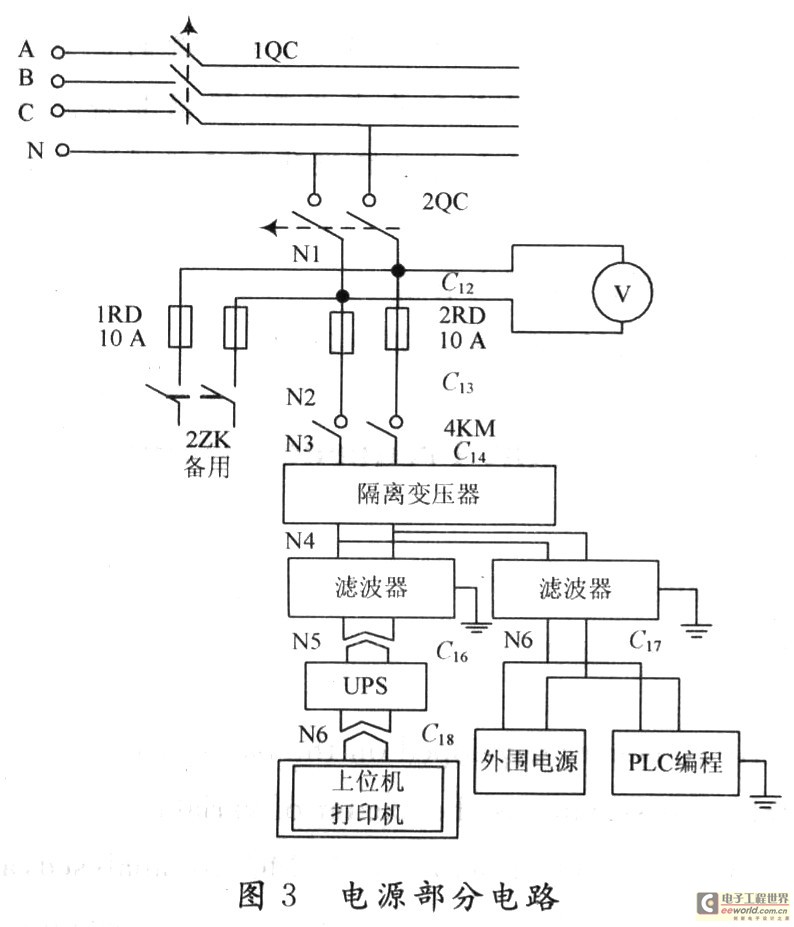 由于系统没有专用电源供电,而是由电网供电。与电网相连的晶闸管整流设备以及脱硫过程中的大功率负载等,在运行时会产生大量的高次谐波,而使交流电网造成污染,电压波形发生畸变。因此现场用来对PLC、打印机和上位机等进行供电的电源带有隔离变压器和电源滤波器,以增强抗干扰能力,电路如图3所示。由于电网中的高频干扰主要不是通过变压器的原、副边线圈的互感耦合,而是靠原副边绕组之间的分布电容耦合的,为此系统采用了隔离变压器,隔离变压器的原副边绕组之间均有隔离屏蔽层,并将零电位线经电容接地,因而该隔离变压器原副边绕组之间的分布电容很小,所以抗电网干扰能力很强。