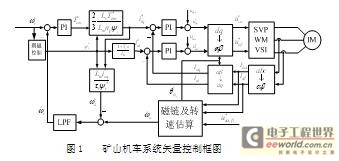 由上面矢量控制的原理可知,异步电机的矢量控制系统就是先对实际电机的三相坐标系下的物理量进行变换,在变换后的坐标系下对电机的磁链和转矩分别控制,确定控制给定量,然后再经过反变换变换至实际三相坐标系系统对电机进行控制的过程。针对前面所提到的矿山机车牵引电机的工作特点,应该在传统的矢量控制中加入转速估算和弱磁控制环节。综合考虑矿山机车系统的特殊要求本系统结构框图如图1所示。