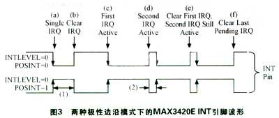| 图3所示为两种极性边沿模式下MAX3420E的INT引脚波形,极性由POSINT位控制。该波形与电平模式相似,但有两处不同,在两种条件下,INT引脚将产生边沿跳变:第一是一个IRQ位变为有效状态(其IRQ触发器产生0到1跳变),此时处理器将清除一个IRQ位(向其写入1),其他IRQ处于悬挂状态,第二个条件是在确保还有中断需要服务时,处理器能够检测到边沿跳变。 | |
