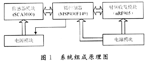 系统组成如图1所示,数据处理单元采用TI公司MSP430系列单片机,无线收发模块采用Nordic公司的nRF905。目前国内外出现了许多典型的无线传感器网络硬件平台,其中MSP430系列单片机以其卓越的性能和超低功耗特性,在电池供电的无线传感器节点设计中具有独特的优势。其低功耗特性有:CPU和外围模块可以在不同时钟下运行,外围模块在不使用时可以关闭以节省能耗;处理器的功耗与工作频率成比例,工作在低频方式下将大大降低处理器的功耗;CPU功耗可以通过开关状态寄存器的控制位来控制:正常运行时电流为160μA,备用时仅为O.1-μA,功耗极低,为设计低功耗系统提供了有利的条件。nRF905无线收发芯片具有功耗低、控制简单、可自动处理字头和CRC校验的优点,MSP-430通过SPI接口及相关指令访问nRF905的内部寄存器。SCA3000-D1是VTI公司的全数字化低功耗三轴加速度传感器,量程±2g,电源电压3.3 V,64组缓冲存储器记录数据,在系统一级上面,有先进的性能和有效节能方式,频响可选,SPI数字串口通信,抗冲击力强,可以运用于许多恶劣的条件下,但是其没有低功耗模式,通过对其电源模块的关断管理进行节能处理。根据传感器测得的倾斜角的连续变化,对系统进行合适的操作,当传感器数据变化到临界点时,使nRF905,MSP430进入不同的功耗模式,通过MSP430控制SCA3000的数据采集,从而有效地降低功耗。整个系统具有电路简单、功耗低、操作灵活、稳定性高、抗干扰能力强等特点。