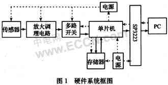 系统硬件框图如图1所示,其中实线为数据流,虚线为控制流。系统工作时,由上位机通过命令来控制下位机进行相应的操作。进行数据采集时,单片机控制电源给传感器供电。各路信号经过各自的调理电路后被送入多路开关。单片机通过控制多路开关来选择所要采样的信号,并将其送入SoC内置的ADC进行采样。采样值被存储后等待与上位机的通信。