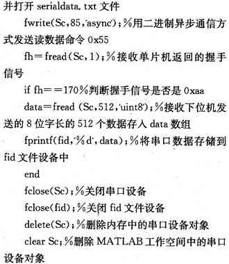 在使用串口进行数据传输时,需要对串口进行读写操作。读写串口的方式分为二进制、文本两种,类似于一般的文件操作。为了提高传输的速度,结合实际情况,本系统采用串口二进制异步读写方式。MATLAB程序通过串行口将命令发送到下位机,并通过串行口接收下位机上传的握手信号及数据。