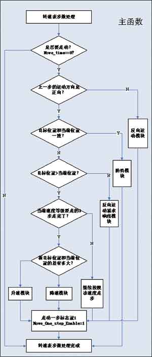 如果目标位置和当前位置不一致,则要进一步判断目标位置是否大于当前位置。如果目标位置小于当前位置,则表明在步进电机的正向运动中检测到反向运动的请求。此时,进入反向运动需求相应模块,逐渐减小步进电机转速,最后改变步进电机运行方向标志位。