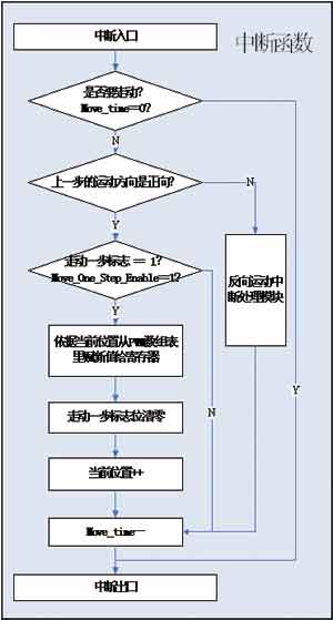 判断转动一步标志位是否为1。若为1,依据当前位置从PWM数组里赋新值给PWM寄存器,步进电机行动一步,当前位置前进一步(若为反向则退后一步)并清零转动一步标志位。这样下次进入中断时,若转动一步标志位没有在主循环里重新赋值为1,步进电机就不会再次转动。