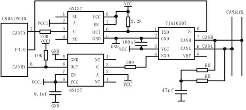 图4是一个以C8051F040为核心的智能节点硬件框图。由于C8051F040集成的是CAN控制器,要使CAN总线得以运行,还需外加CAN总线收发器,常用的CAN总线收发器有Philips公司的PCA82C250收发器、高速TJA1050收发器等。本系统采用了TJA1050高速CAN收发器来替代传统的PCA82C250收发器,TJA1050具有电磁辐射低、防短路、不上电时对总线无影响等特点,它的引脚S可以选择高速或静音两种模式,并可由C8051F040的P4.0控制,CAN总线上两端节点8一般加上两个60W的电阻和47nf的电容对信号吸收,以避免信号反射。为了进一步提高系统的抗干扰能力,在CAN控制器引脚CANTX、CANRX和收发器TJA1050之间并不是直接相连,而是通过由高速光耦6N137构成的隔离电路后再与TJA1050相连,这样就可以很好的实现总线上各节点的电气隔离。这部分增加了节点的复杂性,但它却提高了节点的稳定性和安全性。