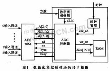 图1所示是本数据采集控制模块的设计框图。图中,数字锁相倍频模块每输出一个有效的采样触发信号CLK,ADC控制器就完成一次6通道的采样操作,然后停止等待下一个触发脉冲的到来。时钟管理模块的作用是利用最小系统板上的50 MHz晶振输入,经过编程进行1000分频,以将其转换成50 kHz提供给AD控制器。至于双口RAM存储模块,由于QuqartusII内部有一个可调用的ROM宏功能模块,因此,在使用时,只要将其调出,并按照本系统的要求对存储容量和地址端口进行设置,就可以作为模块来用。
