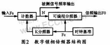 输入信号经整形后可转换为与输入信号同频率的方波信号,其频率为FS,可对其进行K倍频。首先设置一标准的时钟信号,若时钟频率为FC,采用可编程分频器对时钟信号进行分频,其分频系数由计数器提供。若分频系数为N,则输出频率为FC的N分频,即: