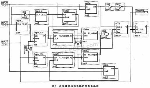 计数器的计数值N在被测周期结束后将立刻送锁存器锁存,并作为可编程分频器的分频系数N。由于采用两路计数器轮流工作方式,因此,锁存器要有选择地对每路计数器的计数结果进行锁存。考虑到要尽可能地减小相位滞后,在每个周期结束后,锁存器应在最短的时间内将数据锁存。这就要求锁存器在锁存脉冲到来前,先选择好被锁存的计数器,保证每个周期计数值的可靠锁存。锁存信号由输入方波信号经微分电路产生,这种设计使可编程分频器在每个周期的开始时刻,总是以新的数据、新的起点开始分频。两路计数器在计数工作前要先清零,使计数器的计数值准确的反映输入信号的周期。清零工作必须在计数结果锁存后的下一次计数开始前完成。数字锁相倍频的顶层电路如图3所示。
