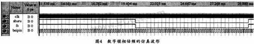 在FPGA软件QuartusII7.2开发平台上完成硬件设计后即可进行仿真,其仿真波形如图4所示。其中,标准时钟clk的频率为10 MHz;shuru:为倍频的输入信号,shuru频率设置为50 Hz,倍频系数为128;beipin:表示倍频电路的输出信号。从仿真中可以看到,本设计可以达到128倍频的效果。