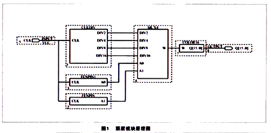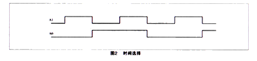 (2)时间选择器:时间选择器实际上是两个分频器,其中一个频率是另一个频率的两倍。本来这两个分频器可以在上述的四频率输出器中实现的,但为了方便地为四选一控制器提供不同的时间选择条件,就将这两个分频器独立开来。这两个输出的的时钟信号组合起来就可以为四选一控制器提供00、01、10、11四个时间选择条件,如图2所示。