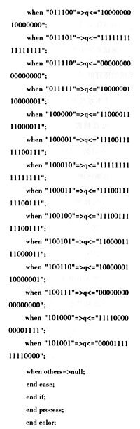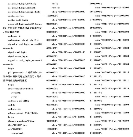 (4)彩灯控制器:彩灯控制电路是整个设计的核心,它负责整个设计的输出效果即各种彩灯图案的样式变化。该程序充分地说明了用VHDL设计电路的“弹”性,即可通过改变程序中输出变量Q的位数来改变彩灯的数目。其中,P1进程对灯闪的速度进行控制,有两种方式可改变灯闪的速度:一是改变外部时钟的赋值,二是改变信号U的位数。P2进程能进行彩灯的图案控制,改变s的位数即可改变要控制图案的数目,改变输出变量O的组合即可变幻彩灯图案。彩灯控制器的实现程序如下: