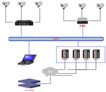 这套视频监控存储设备通过IP网络向所有的视频编码设备,包括视频服务器(NVS)、网络硬盘录像机提供视频监控录像存储空间。其它服务器或监控设备可以直接从磁盘阵列中读取视频监控录像,或者通过视频编码设备读取视频监控录像。