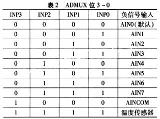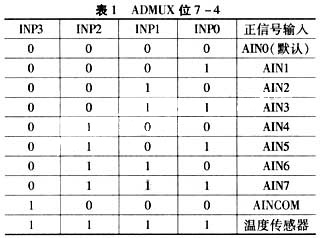 ADC乘法寄存器(ADMUX)的位7-4:INP3-0是输入乘法器正通道,用来选择正信号输入,如表1所列。