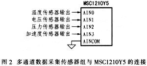 笔者在灯船水文气象实测数据自动显示助航系统水下分机的设计中采用MSC1210Y5作为水下分机的微控制器,用其内置的ADC进行数据采集,外围传感器的输出电压可以采用单端或差分输入的方式直接接入MSC1210Y5的8路通道,不需要任何附加的外围电路,连接电路如图2所示。